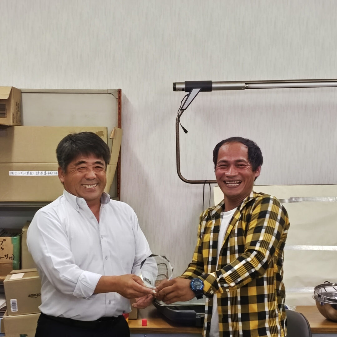 昨年 技能実習期間を満了した実習生の送別会。ささやかではありますが、記念品贈呈と焼肉、たこ焼き風色々焼きで感謝を伝えました。